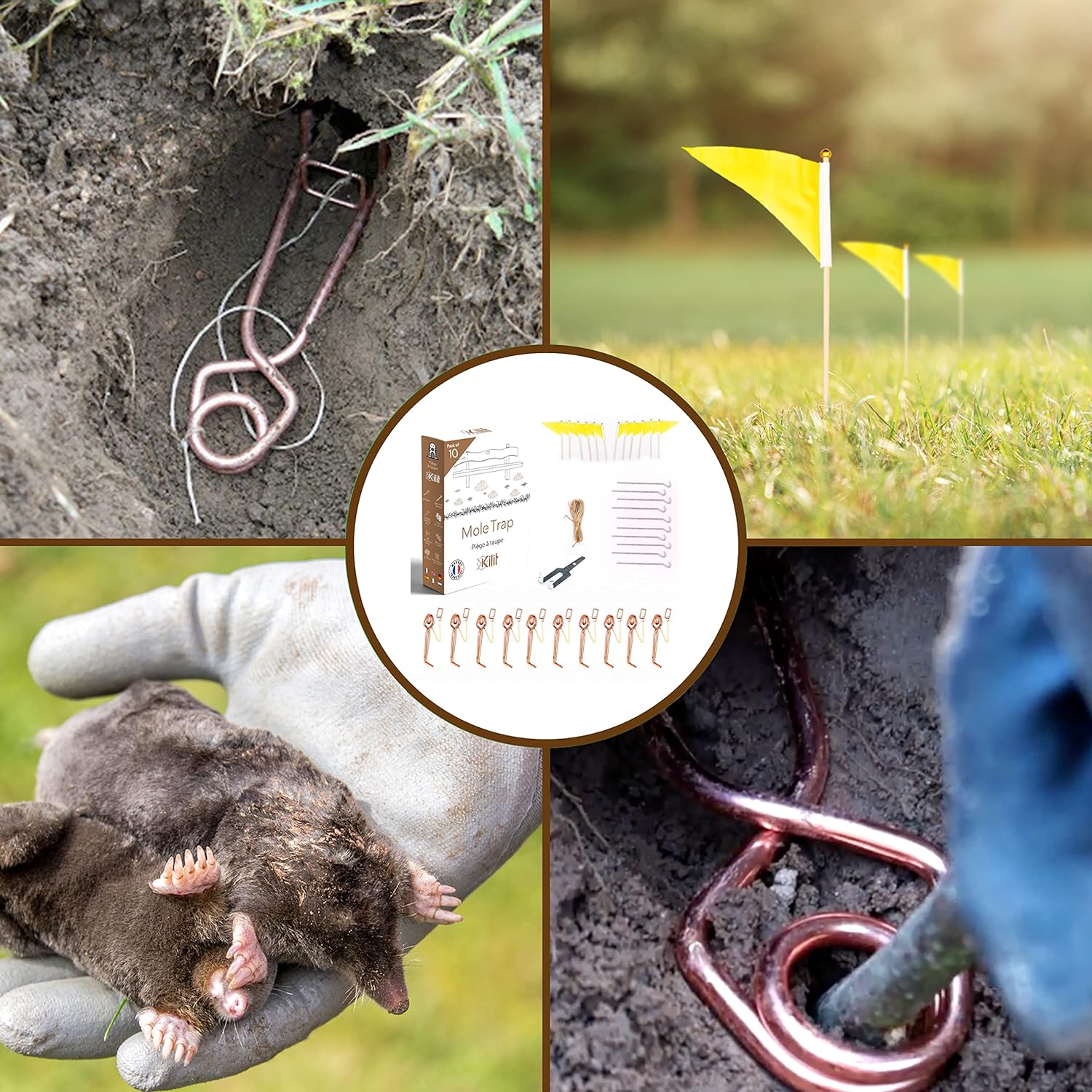 Nos pièges à taupes agissent non seulement comme un répulsif contre les taupes éliminées, mais ils peuvent également être utilisés comme pièges à campagnols, à rats et à autres rongeurs. Il est crucial de bien recouvrir les pièges pour éviter tout passage d'air dans les tunnels, car les taupes ont un flair redoutable.